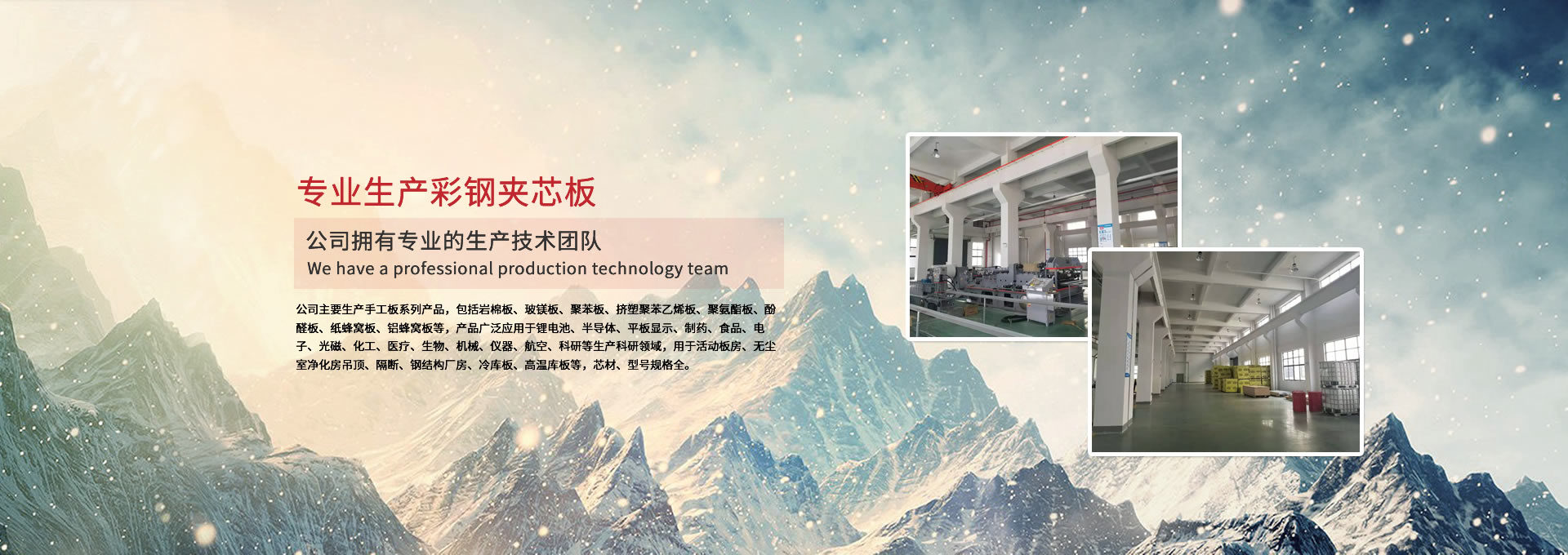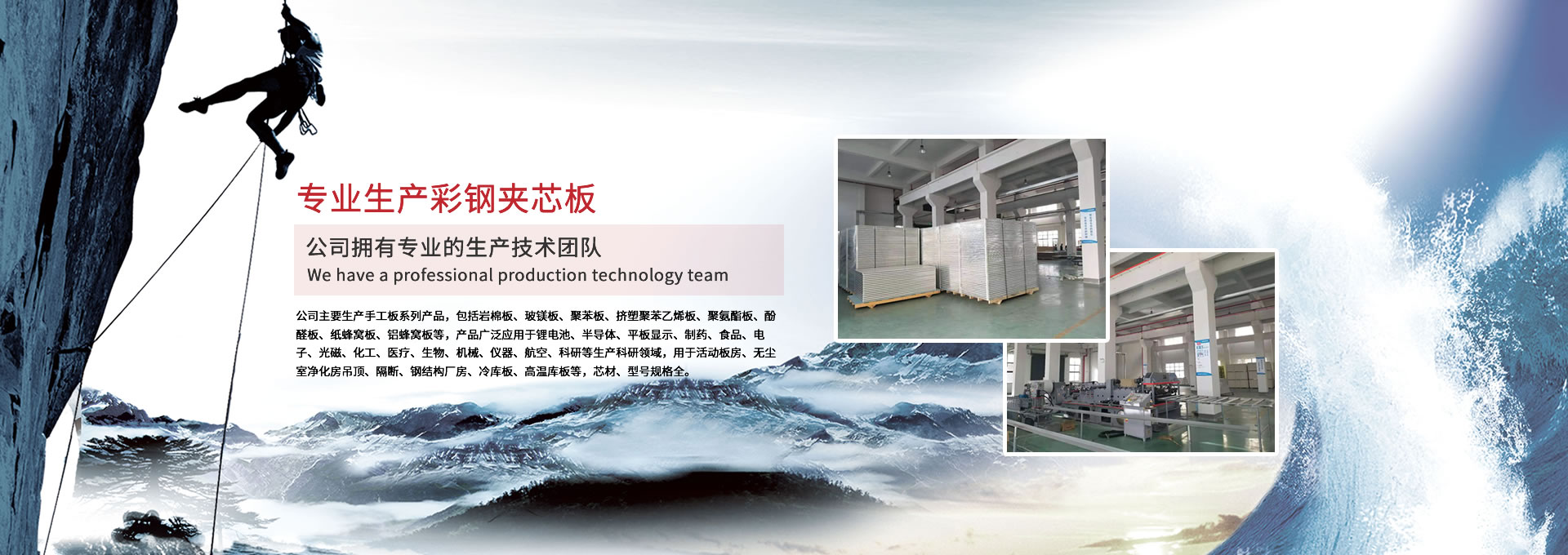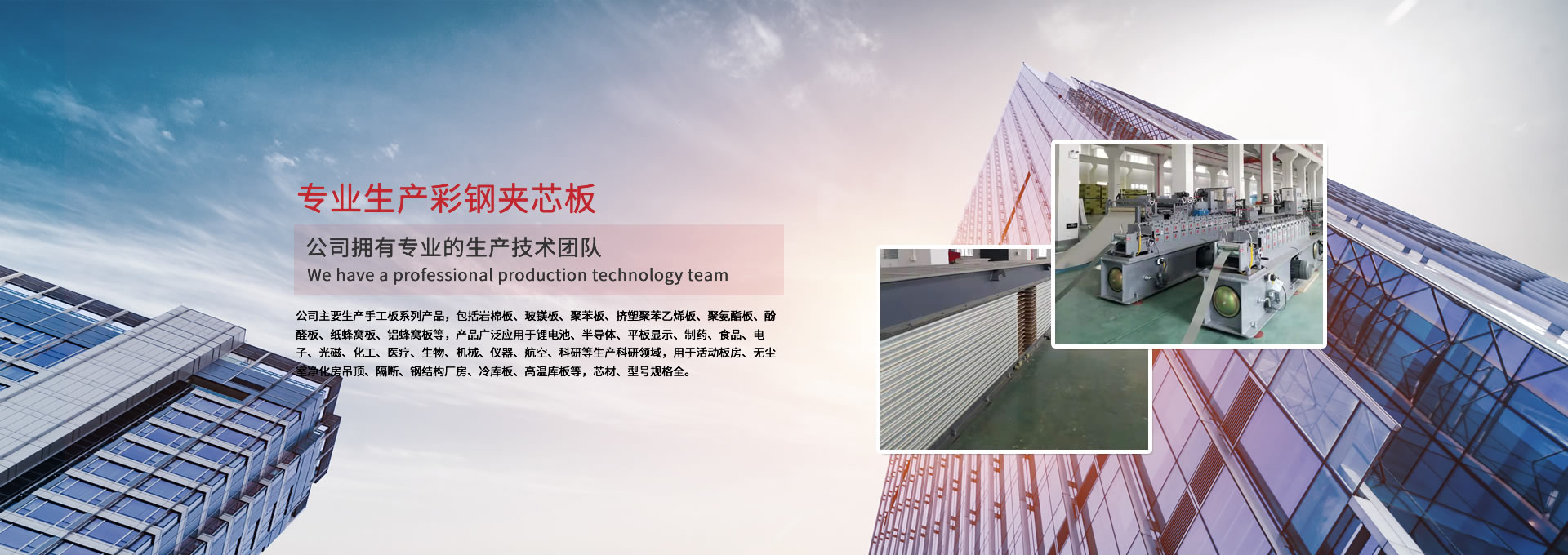 公司主要生產(chǎn)手工板系列產(chǎn)品,包括巖棉板、玻鎂板、聚苯板、擠塑聚苯乙烯板、聚氨酯板、酚醛板、紙蜂窩板、鋁蜂窩板等,產(chǎn)品廣泛應用于鋰電池、半導體、平板顯示、制藥、食品、電子、光磁、化工、醫(yī)療、生物、機械、儀器、航空、科研等生產(chǎn)科研領域,用于活動板房、無塵室凈化房吊頂、隔斷、鋼結構廠房、冷庫板、高溫庫板等,芯材、型號規(guī)格全。 公司擁有專業(yè)的生產(chǎn)技術團隊,周到的服務保證,以“質(zhì)量至上、信譽至上、服務至上”為宗旨,為用戶提供合格的產(chǎn)品和滿意的服務,歡迎各界朋友參觀、指導!公司竭誠希望與各界朋友建立廣泛聯(lián)系,加強相互合作、共同發(fā)展!